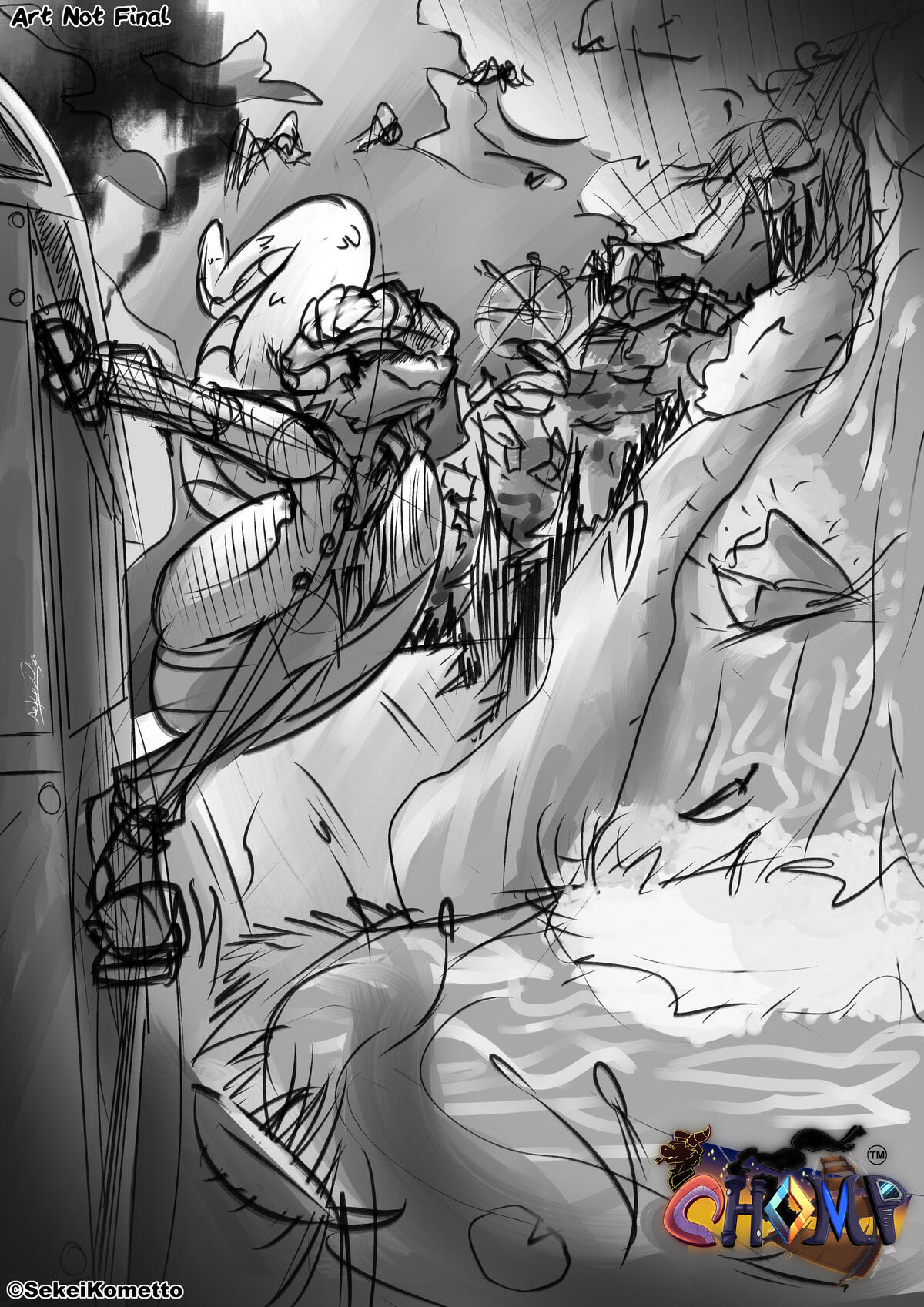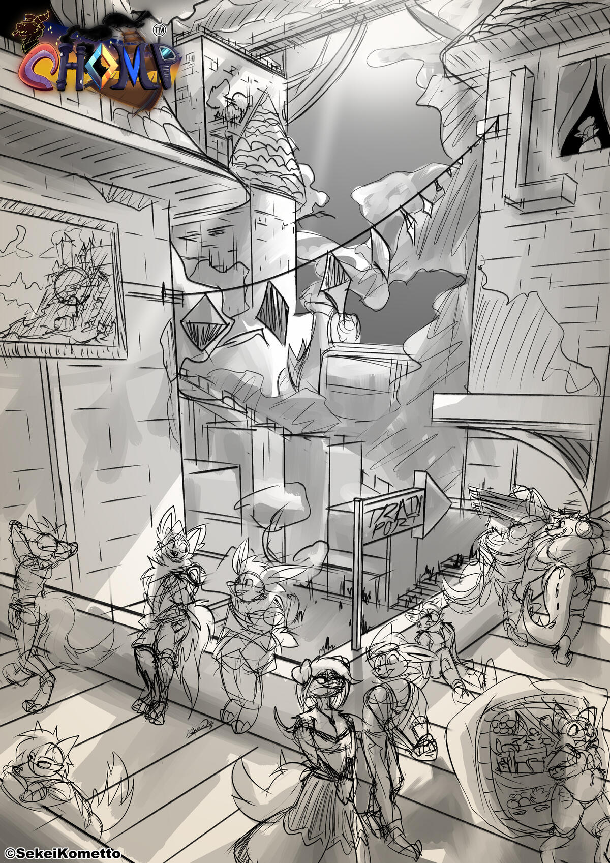 CHOMP is a fantasy/adventure story with slice of life/comedy and darker tones throughout the story and mainly focus on Chomp the red dragon train conductor who has a huge defected tail. The setting takes place in a steampunk world that involve using magic to power up technology and because of their technology there are a lot of train inventors that made their own, Chomp's train which was given by his father a train inventor before he passed, his train was actually a huge success in the transportation era which made him quiet well known despite the fact Chomp doesn't deserve it after his father's passing. But his true goal was to be an heroic explorer which he day dream of many times because he wanted to know more about his mysterious glass shard relic he possessed during his early childhood from his father. His train company is named "C.H.O.M.P." which is based off of the entire 5 train crew member names and the 4 other members are also his coworker friends that he gets along. Each character will have their own backstory, some positives, emotionally impacted, or mysterious which will mentioned throughout the story.